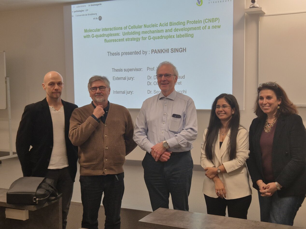 Nous tenons à adresser nos plus vives félicitations à Pankhi Singh, qui a soutenu sa thèse sous la direction du Pr. Yves Mély dans l’équipe Biophotonique des interactions moléculaires et cellulaires. Ses travaux ont porté sur l’étude des G-quadruplex, des structures remarquables des acides nucléiques, ainsi que sur leurs interactions avec les protéines. Ce projet, à l’intersection de la biotechnologie, de la biophysique et de la biochimie, illustre l’excellence et la pluridisciplinarité de la recherche menée au sein de notre laboratoire.