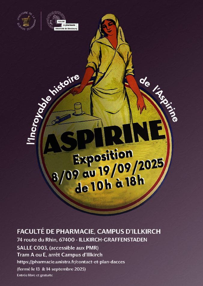 Du 8 au 19 septembre 2025, la Faculté de Pharmacie de l'Université de Strasbourg accueille l'exposition itinérante ASPIRINE. Cet événement met en lumière un médicament emblématique à travers une approche historique, scientifique et sociétale.