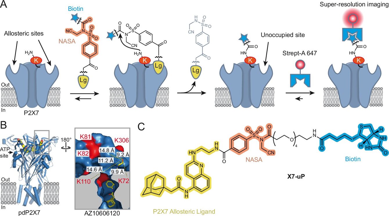 Dans ce travail, nous avons développé une nouvelle méthode chimique permettant de biotinyler spécifiquement les récepteurs P2X7, afin de les marquer à l’aide de streptavidine couplée à l’Alexa Fluor 647. Mise en œuvre dans des cellules BV2, une lignée murine de microglie, et combinée à de l’imagerie de super-résolution (dSTORM), cette approche de marquage permet de révéler et de suivre la redistribution des récepteurs P2X7 à l’échelle de la molécule unique en réponse à une signalisation inflammatoire. Les résultats démontrent pour la première fois une clusterisation des récepteurs P2X7 consécutive à cette réponse inflammatoire. Ces travaux ouvrent de nouvelles perspectives thérapeutiques en identifiant la réorganisation nanoscopique des récepteurs P2X7 comme une cible potentielle pour le traitement de l’inflammation.