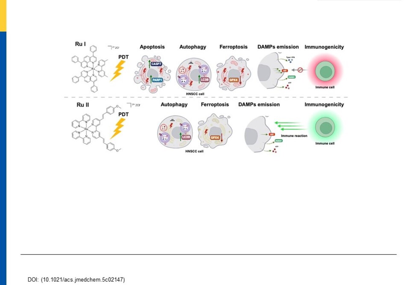 La thérapie photodynamique (PDT) est une stratégie prometteuse contre le carcinome épidermoïde de la tête et du cou (HNSCC). Dans ce travail mené par Chloé Thibaudeau et Alain Jung de l’équipe ONKO3T, en collaboration avec le Professeur Gilles GASSER, ils ont étudié comment différents photosensibilisateurs (PS) à base de ruthénium(II) influencent la mort cellulaire tumorale et la réponse immunitaire.