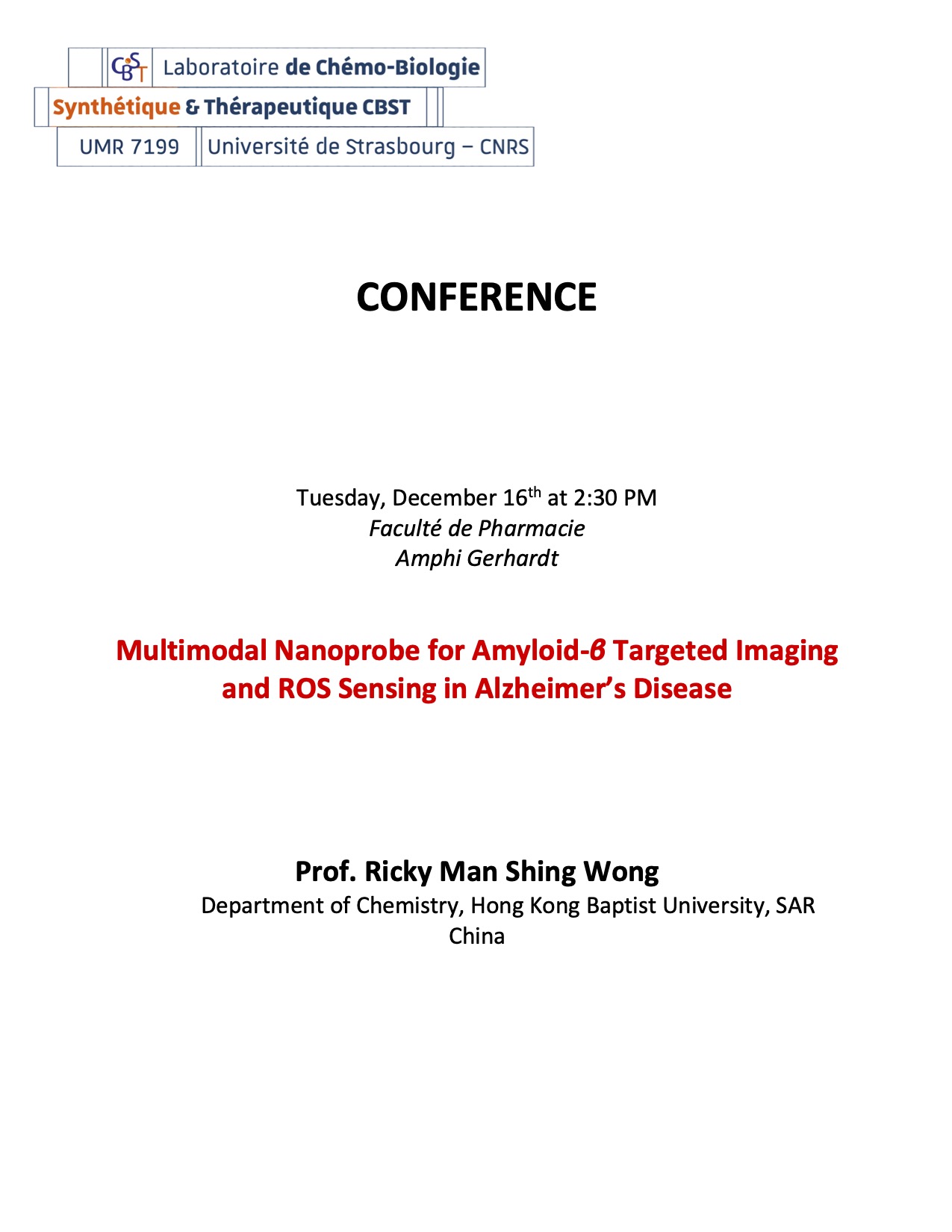 Le Pr. Ricky Man Shing Wong (Department of Chemistry, Hong Kong Baptist University, SAR China) donnera une conférence intitulée “Multimodal Nanoprobe for Amyloid-β Targeted Imaging and ROS Sensing in Alzheimer’s Disease”.